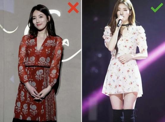 尤其像下图这种印花风格的服装,左边是红色为底搭配上了偏灰的大色块图案,看起来就很显老气,而右边白底小图案的红蓝碎花,就是一整个清新又清爽。