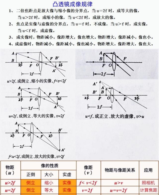 其三,我们把物体在三个区域、两个特殊点的成像原理图都画出,并总结归纳出完整的成像规律如下图所示。