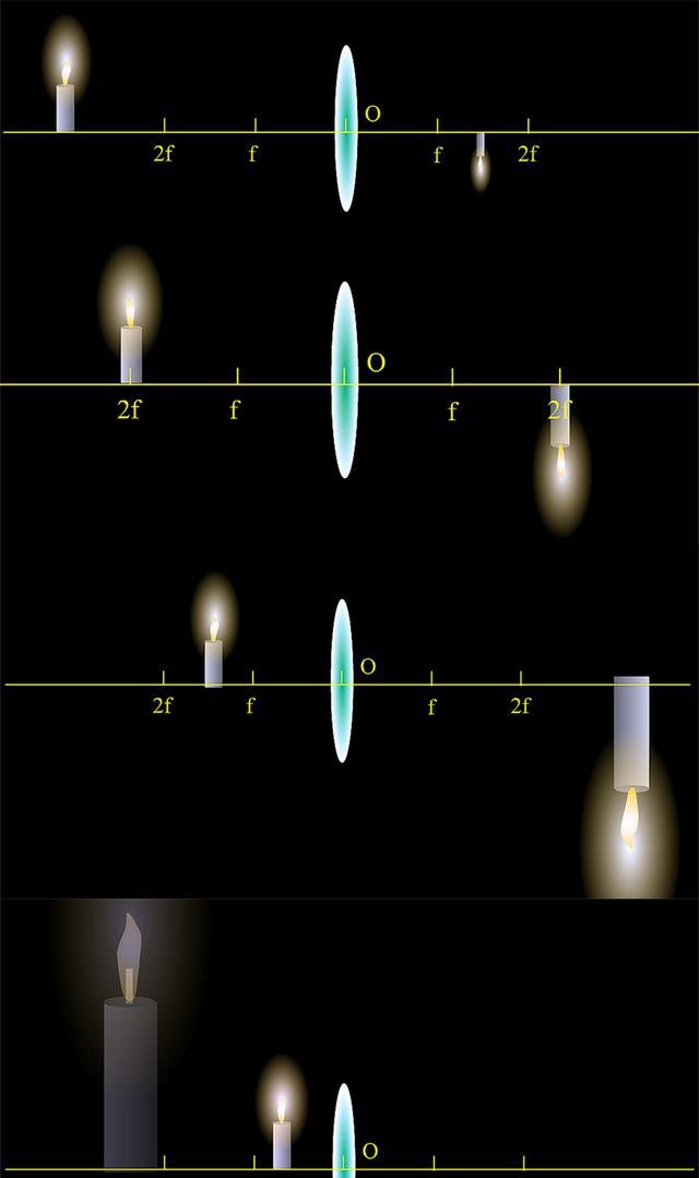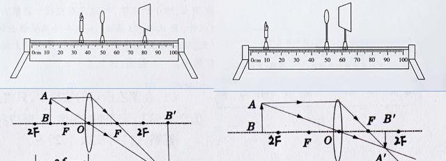 如下图所示,当物体在一二倍焦距之间时、二倍焦距之外时,其光路原理图与实物图要条件反射般的对应起来,就是说,只要看到上面的实物图,就要立刻想到自己已经掌握住的光路原理图,从而迅速得到答案。