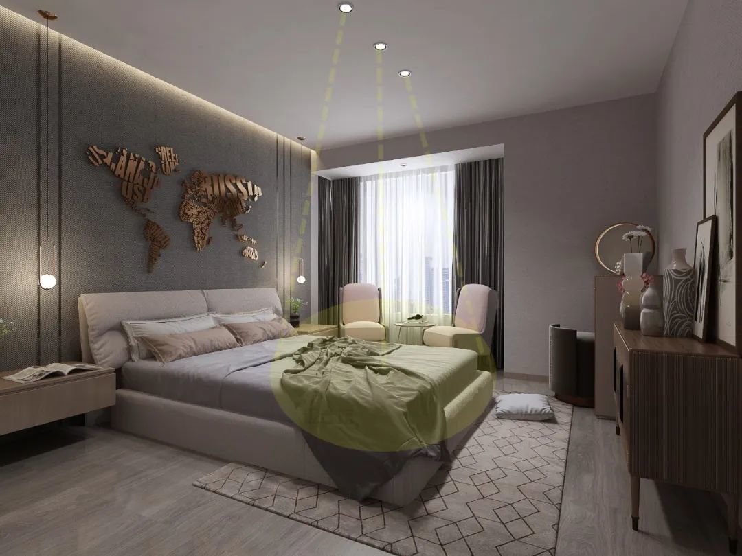 装在天花上的无主灯,有筒灯、射灯与灯带可选,具体要根据卧室的吊顶情况来看,但无论是哪种灯具,无主灯的光源要避开枕头区。
