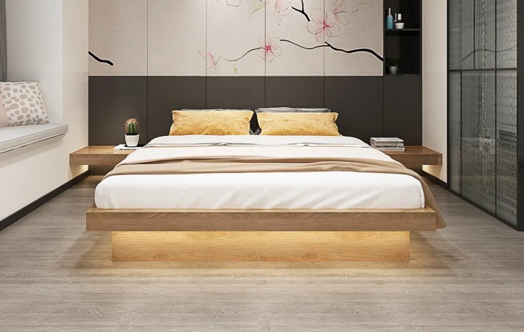 现在定制榻榻米或地台床是很流行的一种做法,在定制床的床沿下方加入灯带,照亮床铺下的地面,光线反射到卧室空间,也是睡前氛围灯不错的选择,夜起时找鞋子也很方便。