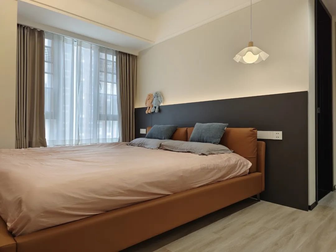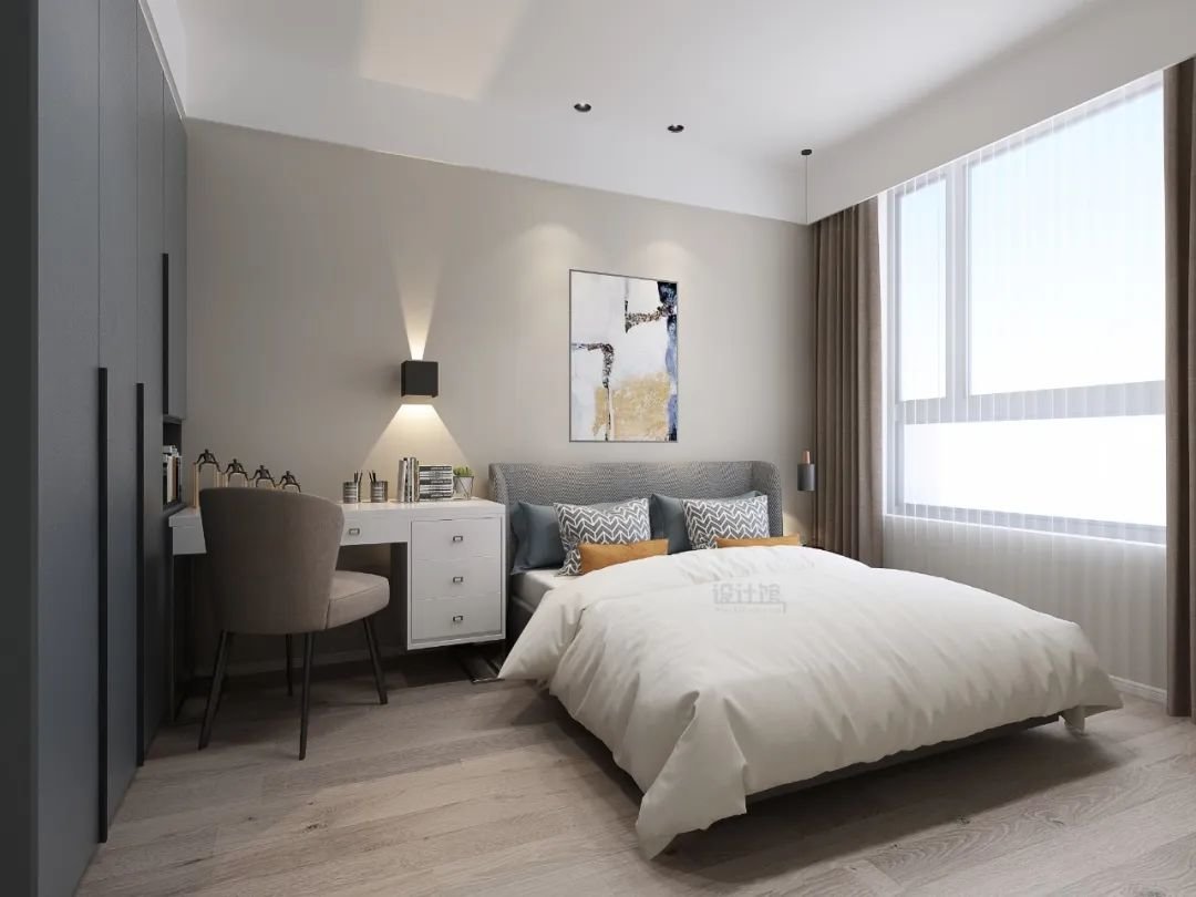 床头墙没有做靠背造型,是乳胶漆或壁纸墙面的话,可以在床头墙上安装壁灯,用壁灯也可以充当睡前氛围灯,也能增加床头墙的设计层次感。