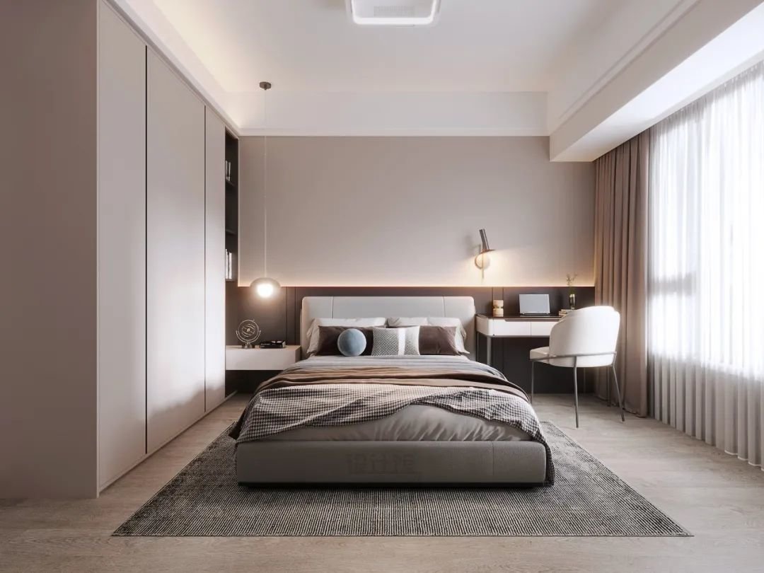 灯带适合四周凹吊顶的情况,把灯带藏在吊顶或窗帘盒里面,光线通过天花与吊顶反射下来,整体照明效果会更加均匀舒适,不会有刺眼的光线,更能营造温馨舒适的卧室氛围。