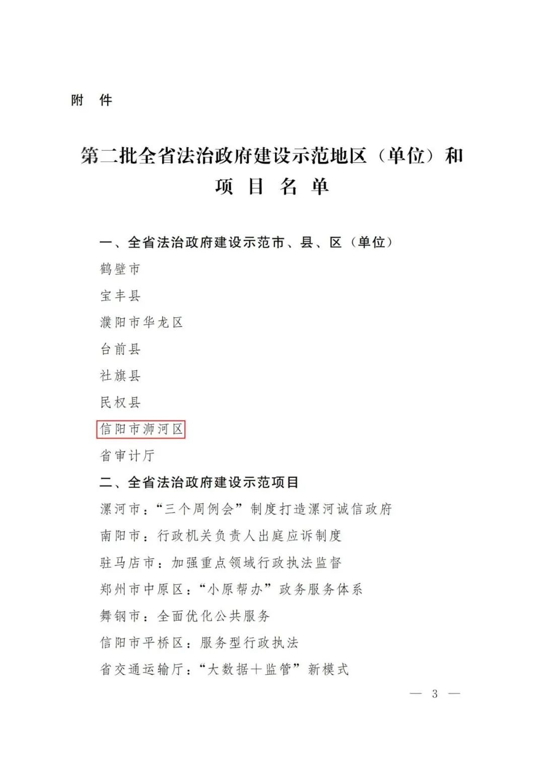 2023年2月2日,河南省法治政府建设领导小组办公室发布《关于第二批全省法治政府建设示范地区(单位)和项目命名的决定》,全省法治政府示范市、县(区)、单位仅有8个入选,浉河区名列其中,成为信阳市唯一入选综合示范地区的县(区)。