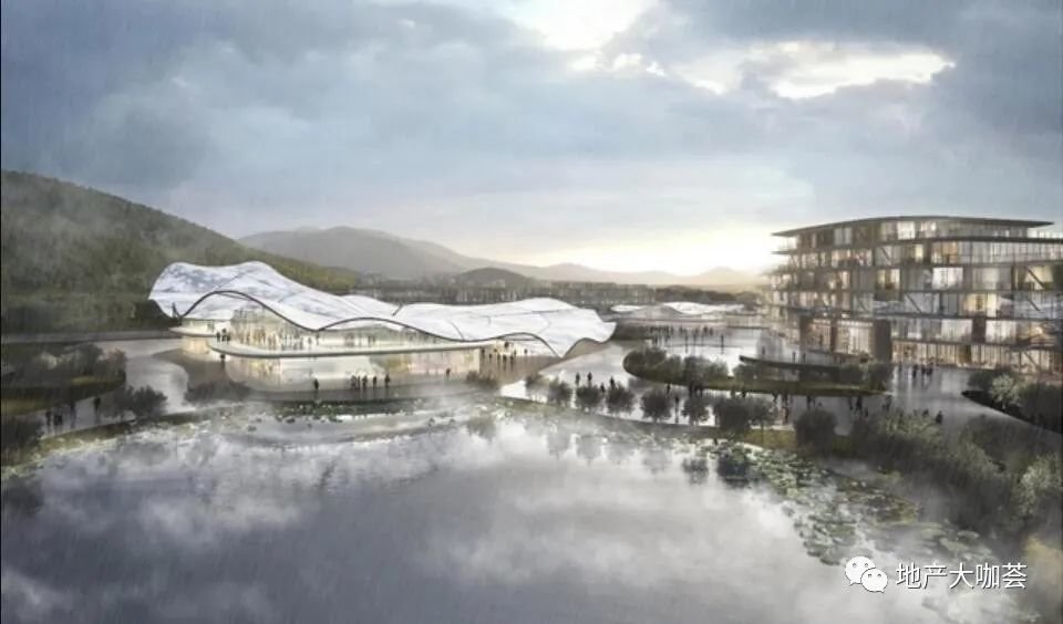 这个设计作品的牛皮之处在于,该项目依山而建,整个项目以高、中、低搭配,包含:花瓣高层洋房、雁群别墅、艺术村落、以及会所艺术中心、群岛式商业街。