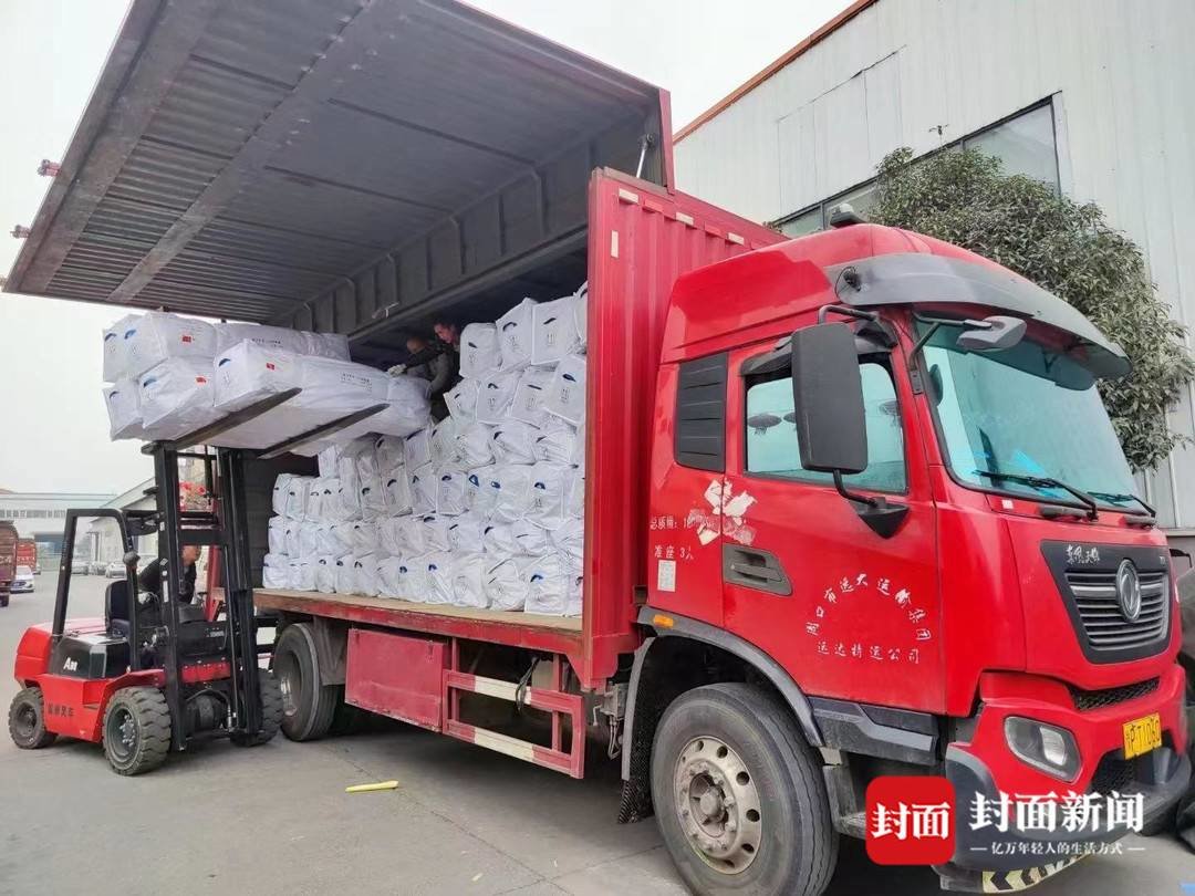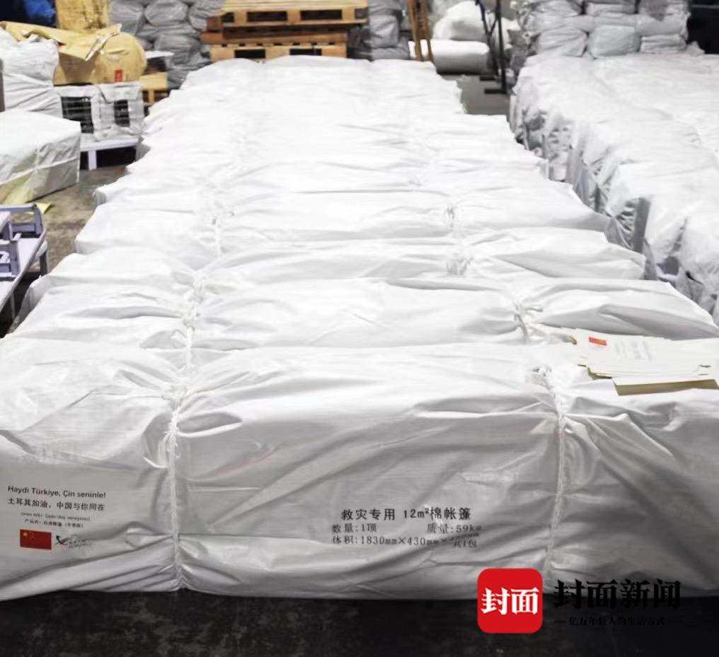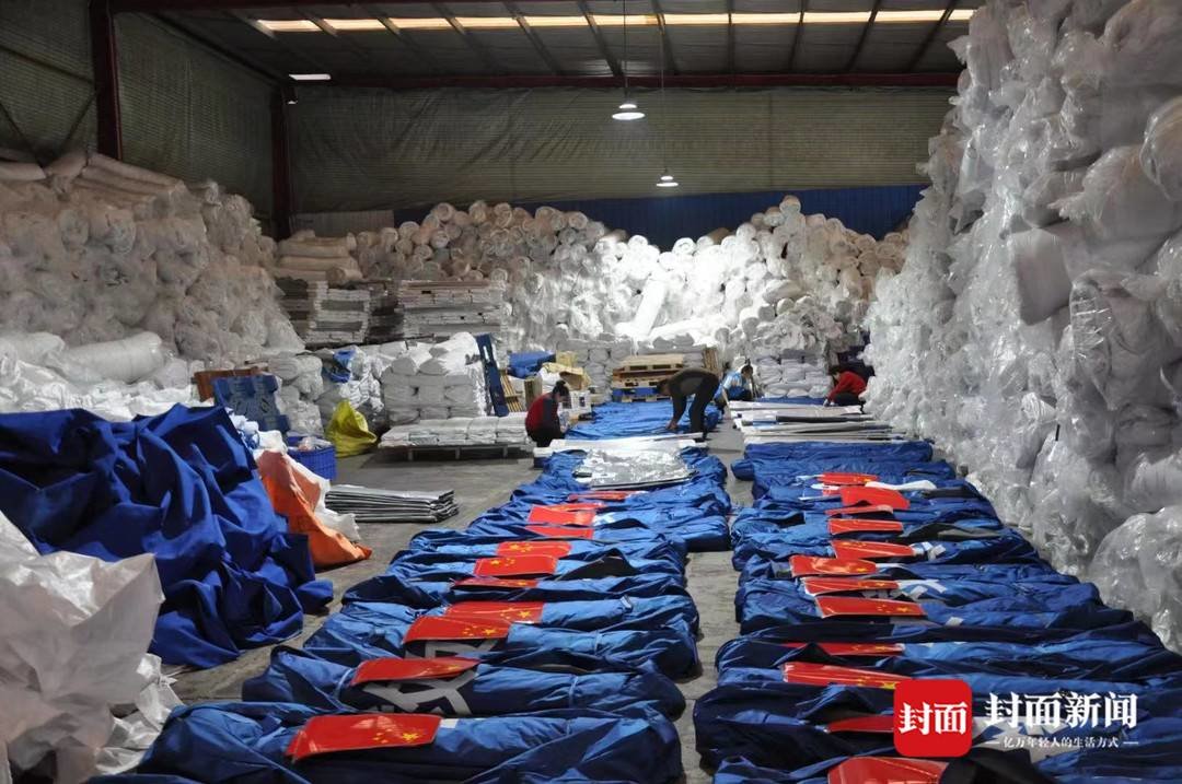 尽管是周六,刘新伟告诉封面新闻记者目前全工厂的员工依然在一线赶工。“所有的应急物资都要保质保量,还要抢速度。”刘新伟透露,这批运往土耳其的救援物资每个包装袋上都贴上了中国国旗,也印着“救灾专用棉帐篷”的字样。