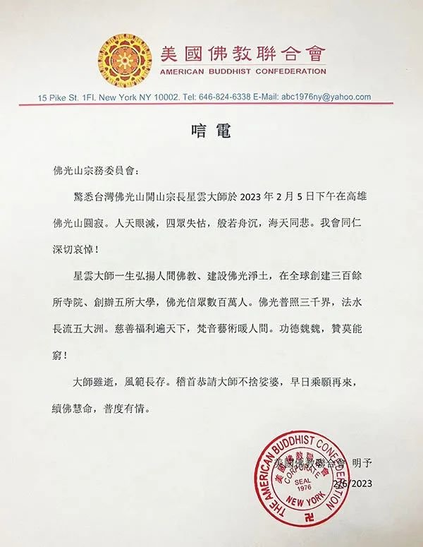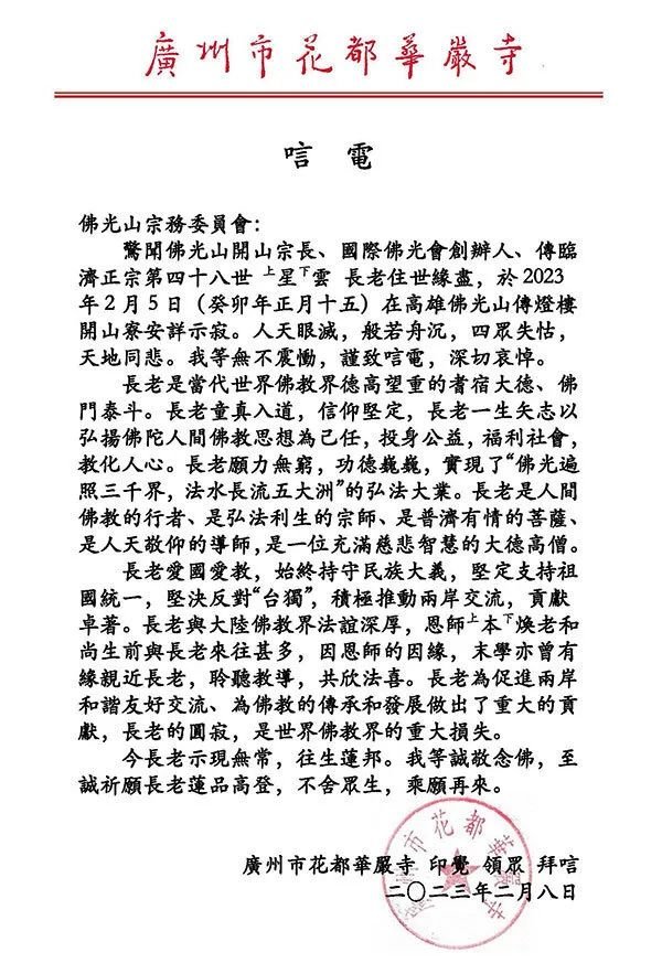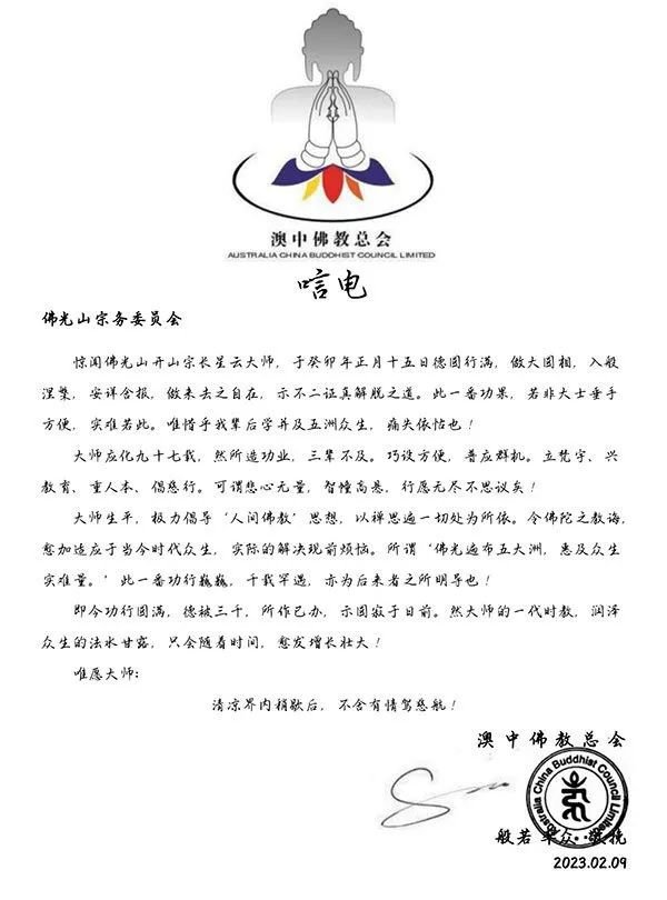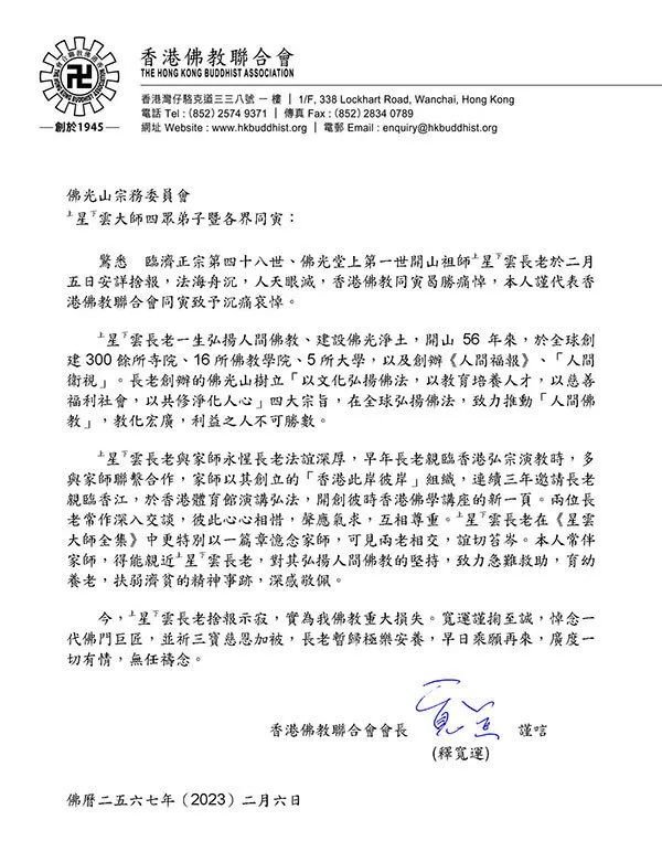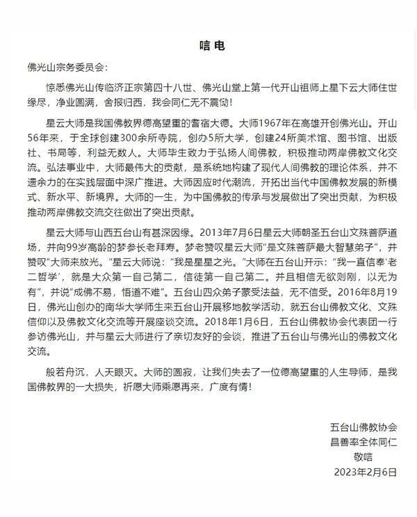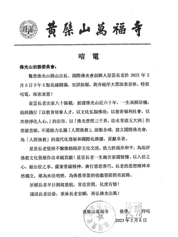 惊悉星云大师缘尽舍报,于2023年2月5日在佛光山传灯楼开山寮安祥示寂,悲痛无量,特致唁函,深表哀悼!