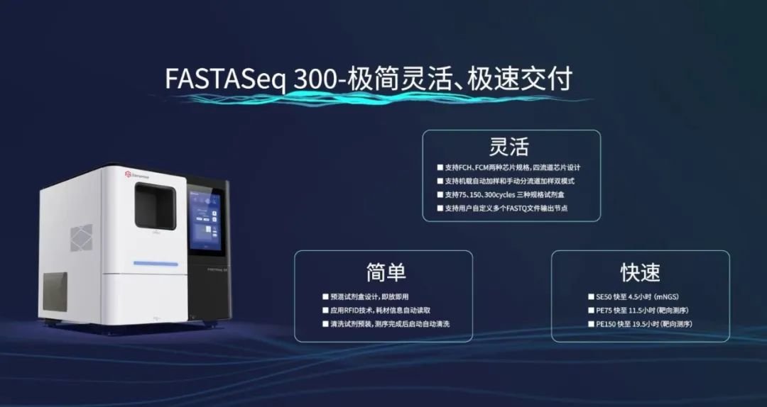 FASTASeq 300是真迈生物自主研发的一款主打靶向测序、全基因组低深度测序的中小通量桌面型基因测序平台。其拥有FCH和FCM两种规格测序芯片,支持“机载自动加样”和“手动分流道加样”双模式,可覆盖SE50~PE150等多种测序读长,在24小时内即可完成6~16个肿瘤大Panel样本的测序工作,加之其耗材即放即用,耗材信息自动读取,测序后自动清洗等优点,为用户提供了快捷、灵活的工作流程,助力肿瘤检测技术本地化能力建设。