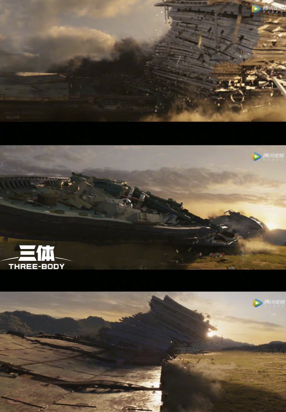 船被切开后的呈现形式是比较难的,没有任何相关资料可以借鉴,这么大的船被切开之后,船体怎么扭曲?碎片如何摊在地上?团队花了很长时间,在计算机上做船的钢体碰撞、扭曲效果模拟。