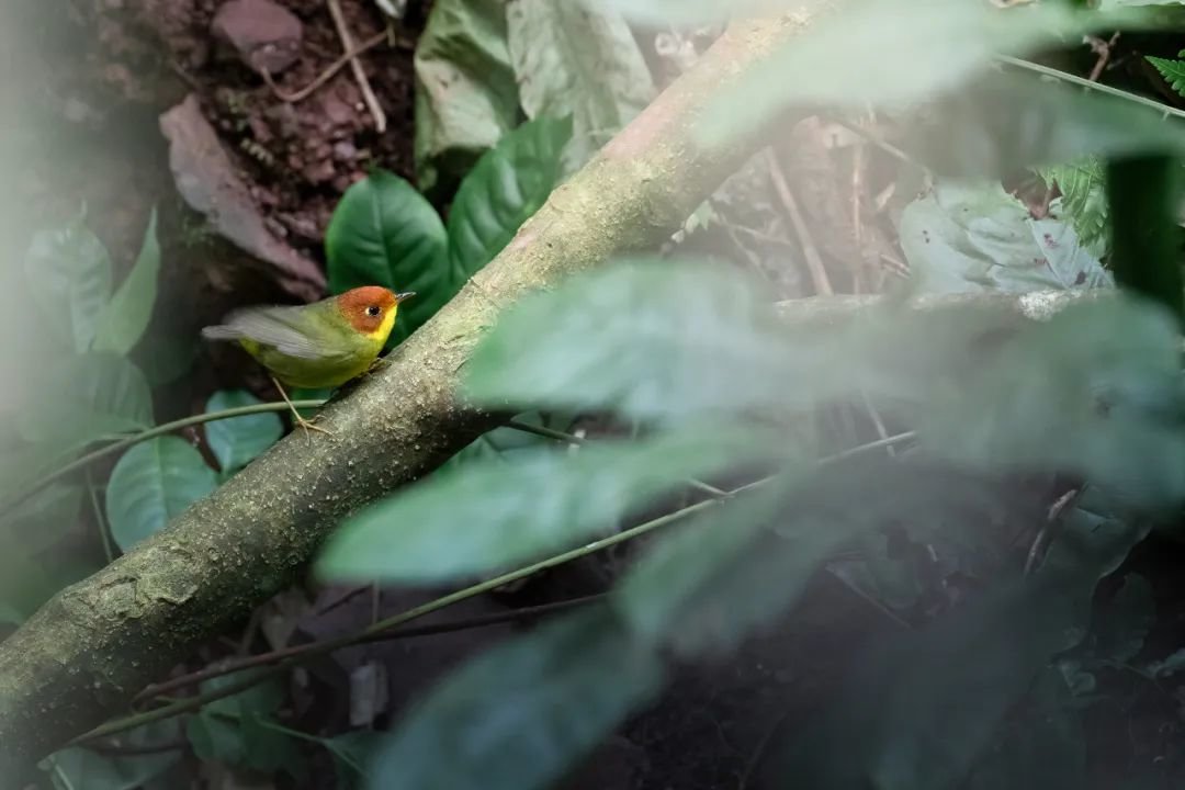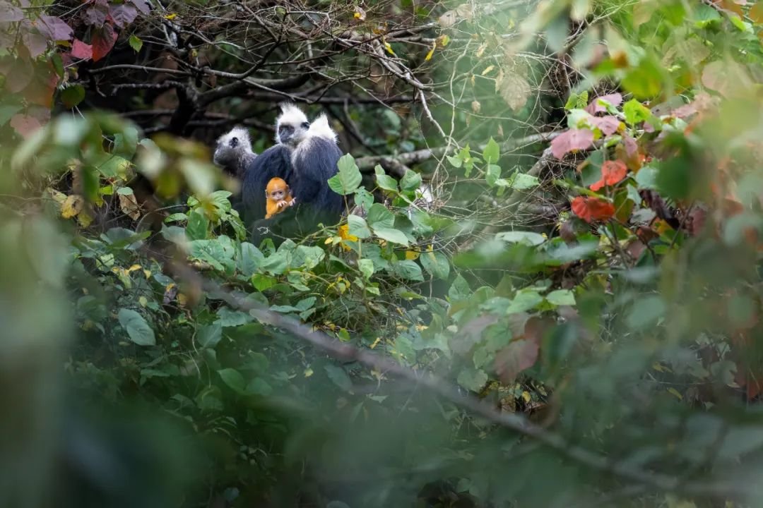 我的注意力被白头叶猴群中的一抹金色吸引,是今年第一只出生的小猴!它浑身是耀眼的金黄色,与家族中长辈的黑白配色截然不同。400mm是我在密林中拍摄野生动物最喜欢使用的定焦焦段之一,这支镜头既能拍摄细节丰富的特写,也能兼顾包含生物与环境关系的生境照创作。我利用长焦和大光圈的优势,选择合适的前景营造出柔和的虚化效果,拍摄下了这幅珍贵的画面。