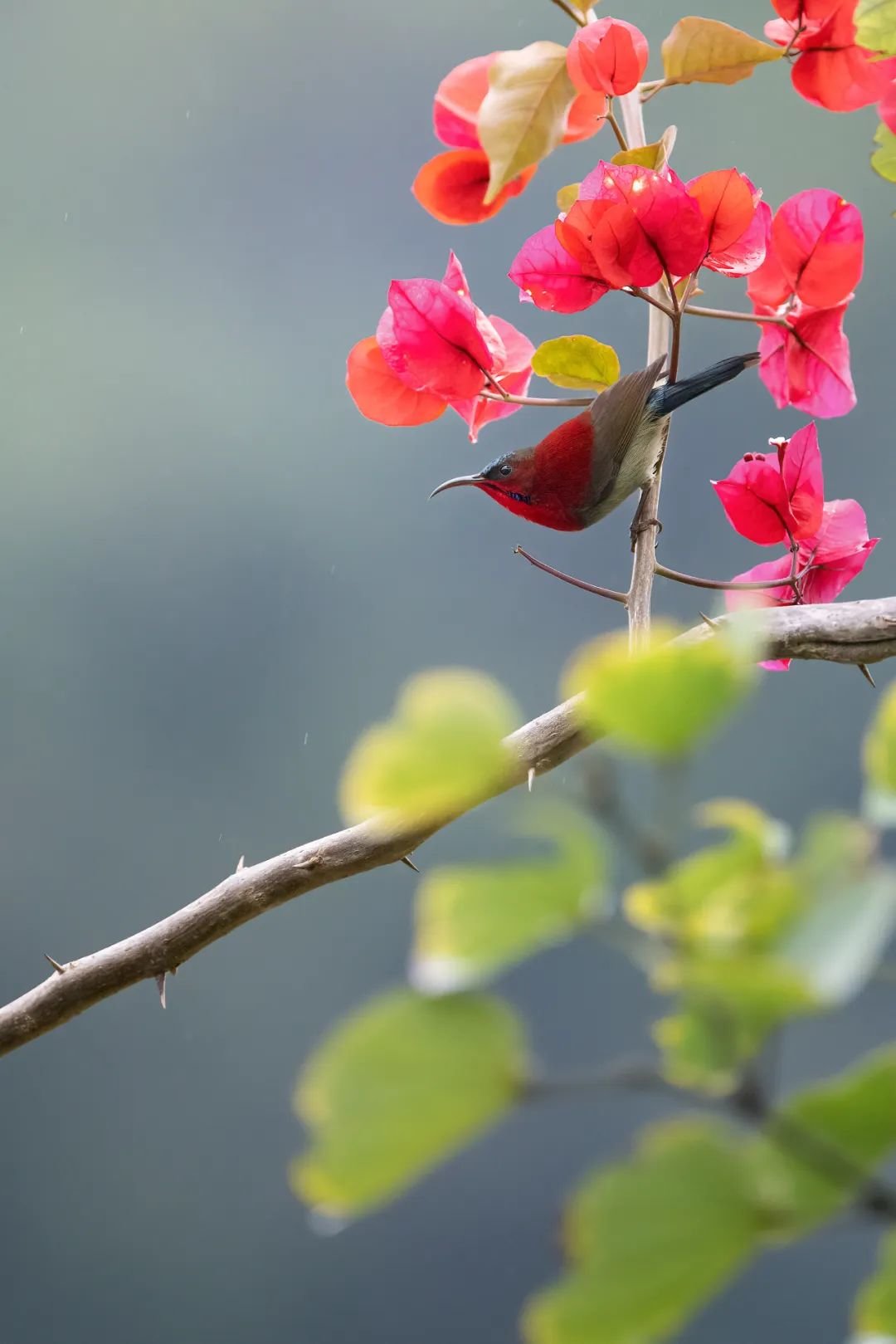 走出保护区,我看到一个红色的身影在枝头跳跃——黄腰太阳鸟!这种小鸟是新加坡的国鸟,艳丽的配色透露出一股浓浓的热带风情,它体型娇小,在三角梅的枝头灵活地闪转腾挪,吸食花蜜,这支尼康尼克尔 Z 400mm f/4.5 VR S支持高速、精准、无声的自动对焦,在对焦性能上做到了目前Z卡口镜头中的顶级,搭配上尼康Z 9的旗舰机身的鸟眼识别对焦,帮助我牢牢锁定住这只好动的小家伙。
