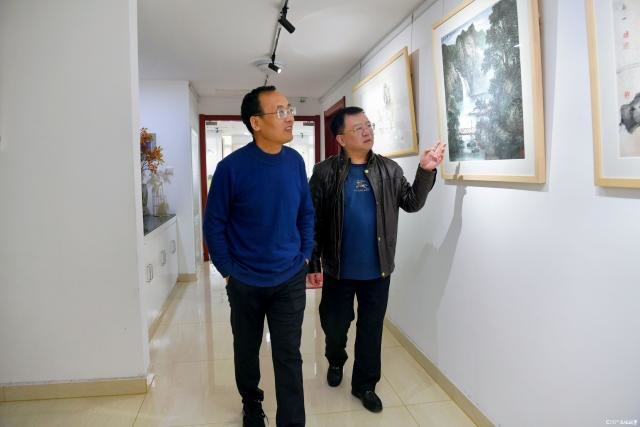 闲聊过后,几人共览中华艺术空间,其中陈列着众多名家名作,有到访艺术家现场创作留下的作品,也有名家赠送的墨宝。梁洪文董事长为两位书法家一一讲解这些佳作背后的故事。漫步时,张教授和徐博士不时驻足,细品书画作品的艺术风格和特色,交流和分享彼此的心得体会。