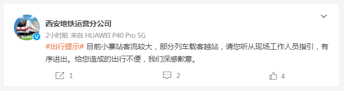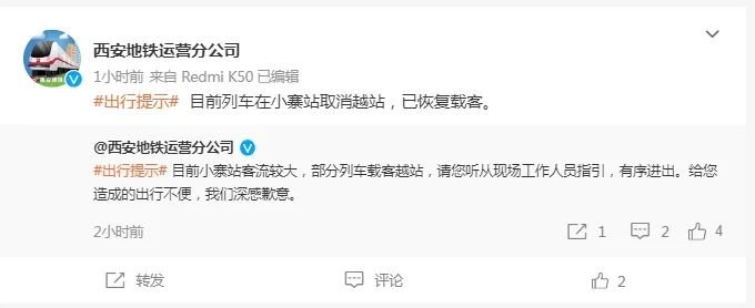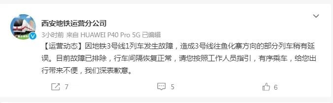 对此,西安市轨道交通集团有限公司运营分公司于8时10分进行解释,因地铁3号线1列车发生故障,造成3号线往鱼化寨方向的部分列车稍有延误。目前故障已排除,行车间隔恢复正常。同时,因周一早高峰线网客流较大,目前部分线路及车站采取了客流控制措施。