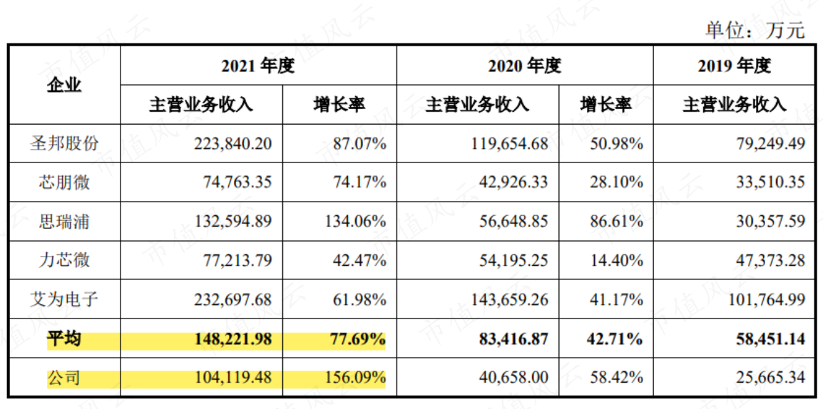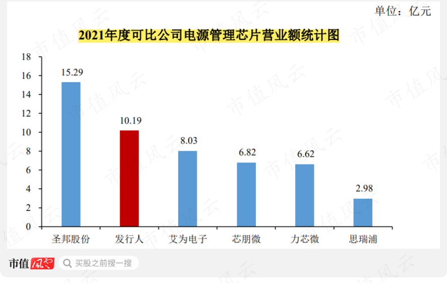 公司主营电源管理模拟芯片,占总营收98%左右。根据营收统计,2021年,公司在几家内地可比公司当中已经跻身第二。