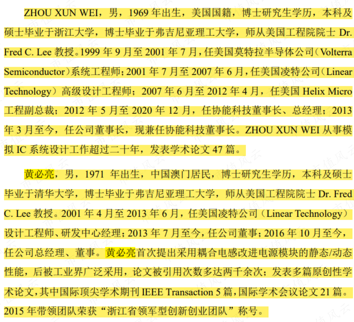 杰华特核心研发人员也是公司的两位联合创始人,也是当前实控人,Zhou Xun Wei和黄必亮,二人在创立公司前师出同门,都拥有顶尖的教育背景、科研实力和从业履历,相当加分。