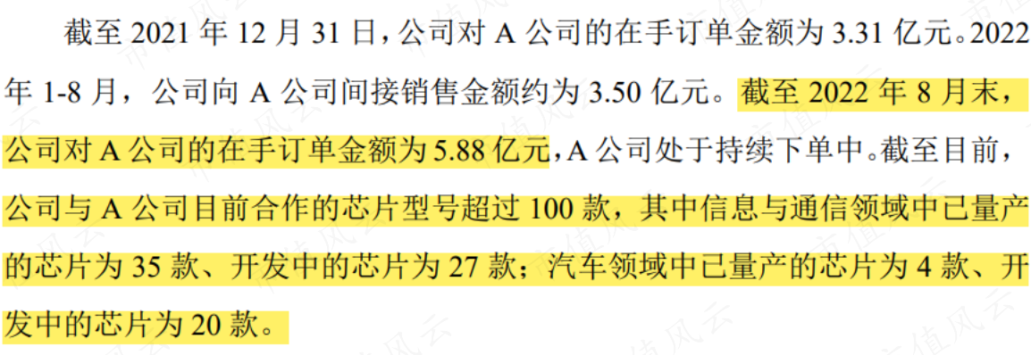 对于公司各领域的终端客户构成,我们可以从截至2022年1月在手订单情况了解一二,公司没有披露具体名称的第一大客户A公司也位于“通讯和汽车电子”板块。