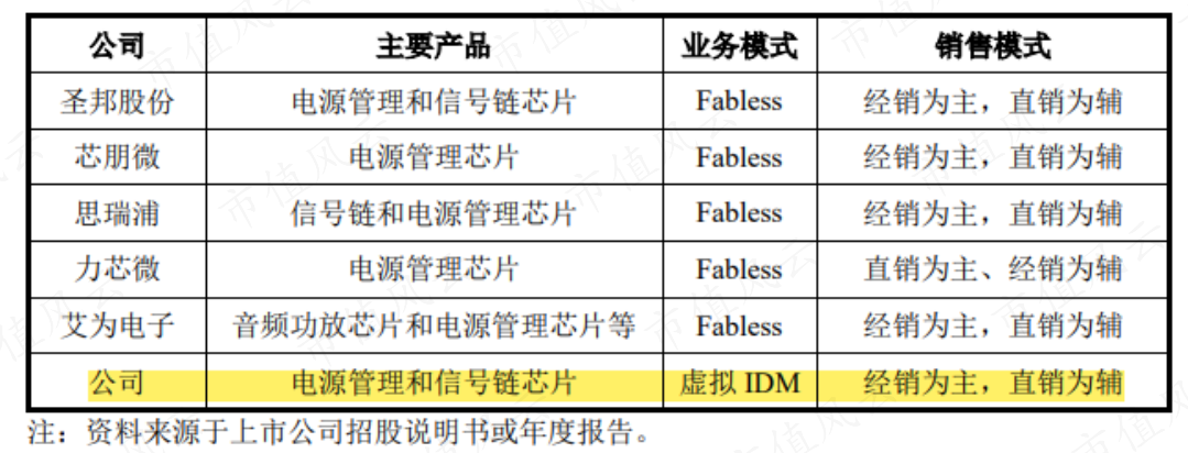 公司表示,这也是电子元器件领域的行业惯例,比如可比公司当中只有力芯微以直销为主,其他全部主打经销模式。