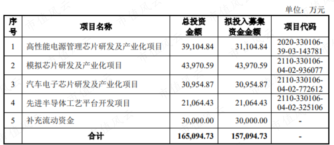 此次IPO上市,公司计划募资15.7亿,包括高性能电源管理芯片、模拟芯片、汽车电子芯片的研发和产业化,以及先进工艺平台开发等。