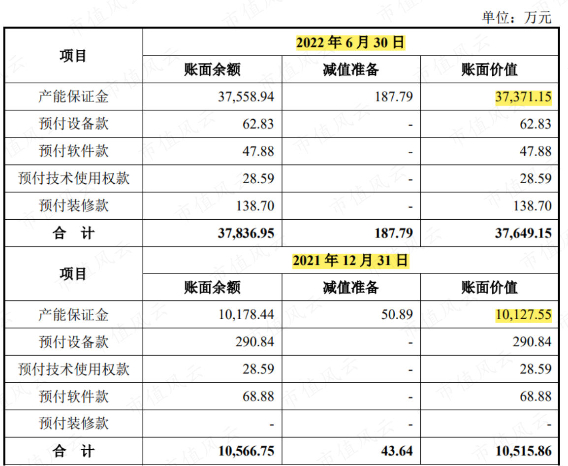 这也就引出了一个关键领先指标:产能保证金。一般会在其他流动资产和其他非流动资产科目当中披露,以后者为主且一年内到期的产能保证金计入前者。
