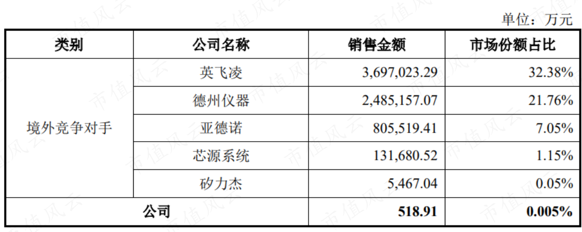 通讯电子领域的行业集中度偏低,排名第一的海外竞争对手亚德诺市占率也仅为4.54%,公司在国内的主要竞争对手为思瑞浦,市占率0.49%,而公司为0.18%。