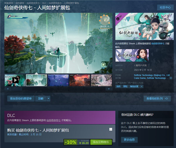 1月末,《仙剑奇侠传》官方曾宣布,将在2月推出《仙剑奇侠传7》的首个DLC《人间如梦》。