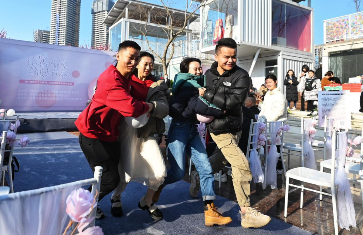 此外,在高新南区政务大厅、桂溪生态公园点位,开展了“文明婚俗新风倡议”签名活动。温江区民政局婚姻登记处则举办了新婚集体颁证活动,邀请专业婚姻家庭咨询师和心理咨询师,为新人量身定制了一套新婚集体小游戏。