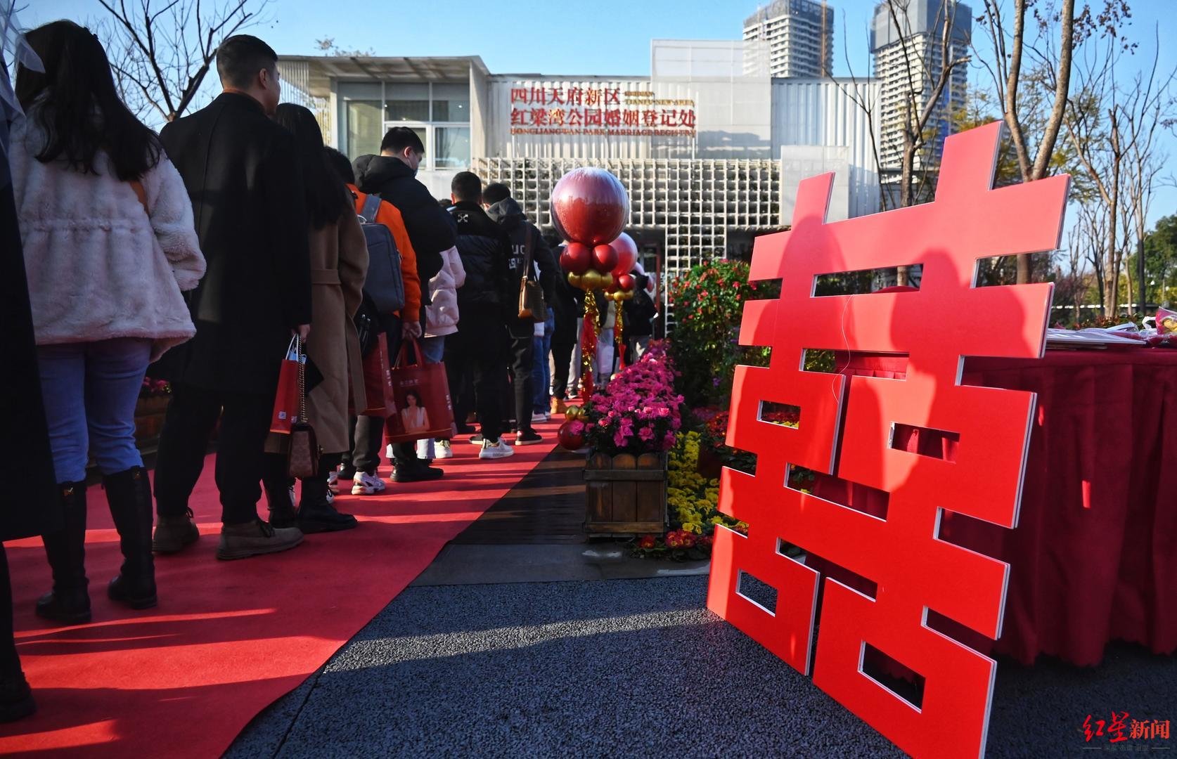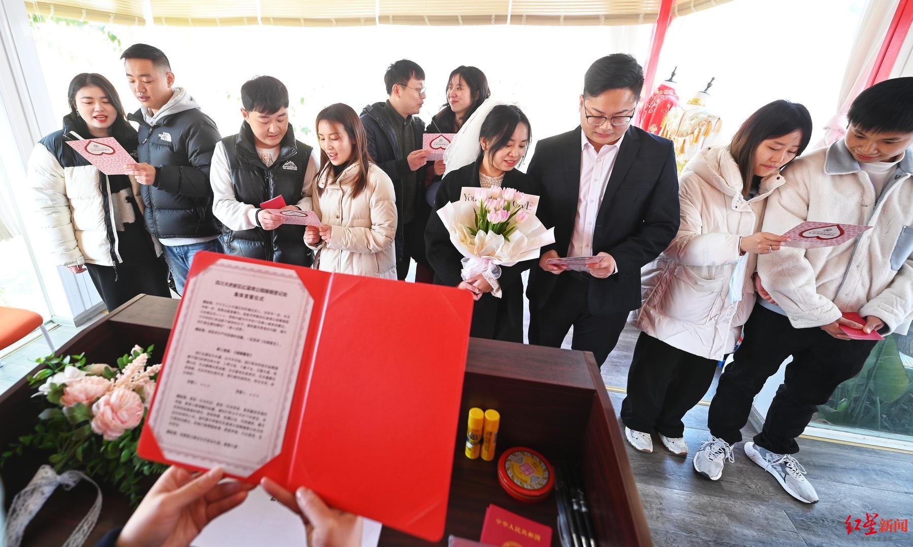 红星新闻记者从四川省民政厅了解到,“2.14”四川全省预约登记共4330对新人,成都市预约登记1012对,迎来2023年第一个结婚领证高峰。