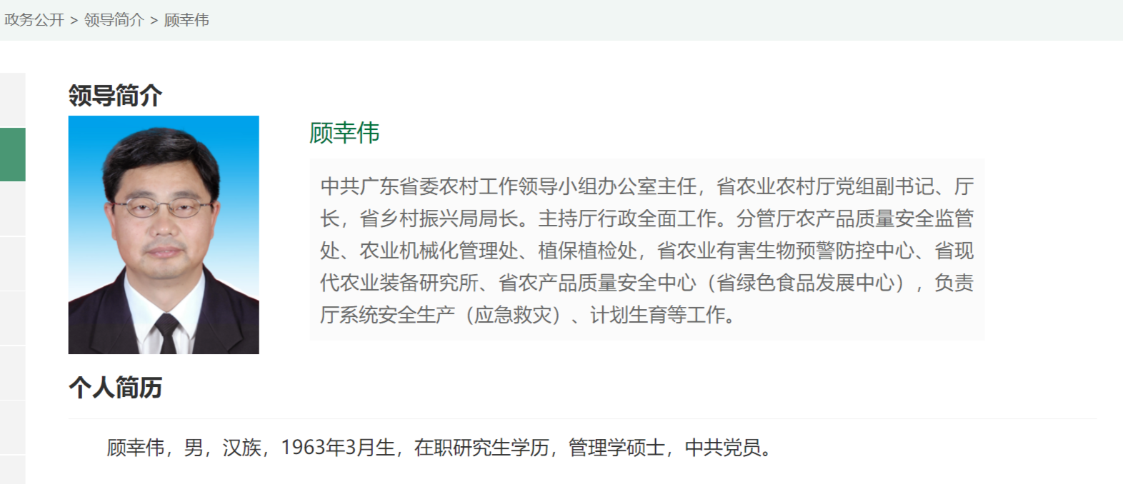 红星新闻记者看到,2月14日下午,顾幸伟的简历及工作分工依旧在广东省农业农村厅网站上可见。网站信息显示,顾幸伟主持广东省农业农村厅行政全面工作,分管厅农产品质量安全监管处、农业机械化管理处、植保植检处,省农业有害生物预警防控中心、省现代农业装备研究所、省农产品质量安全中心(省绿色食品发展中心),负责厅系统安全生产(应急救灾)、计划生育等工作。