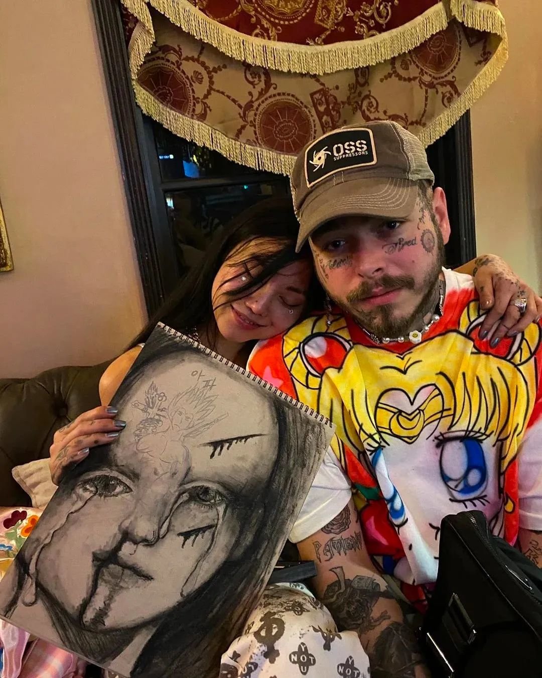 那段时间两人显得十分亲密,MLMA 会为 Post Malone 化妆、涂指甲油,而 Post Malone 甚至在嘴唇上写上「LOVE」的字样。