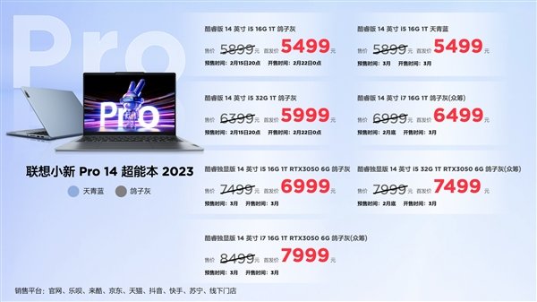 小新14 2023中,i5+16GB+1TB版4799元,i5+16GB+512GB版4199元。