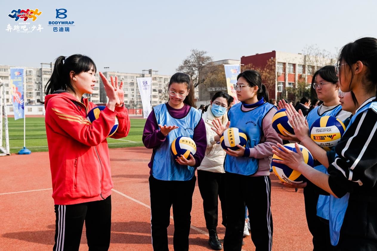 2月15日上午,在濮阳市油田第三高级中学,河南排球冠军运动员冠军运动员黄瑞蕾、蔡晓晴带领孩子们进行热身,手把手地教孩子们转圈垫球、3米线小碎步中线抢球训练,双人跳网并与学生们进行友谊赛。