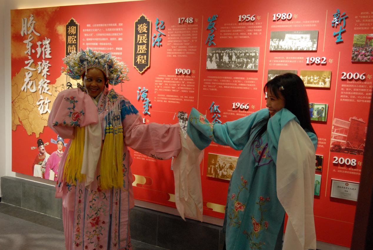 1月15日,山东省青岛市即墨区移风店镇地方戏柳腔民间艺人在教长江学校外籍教师非洲博兹瓦纳共和国Dudu学唱柳腔。