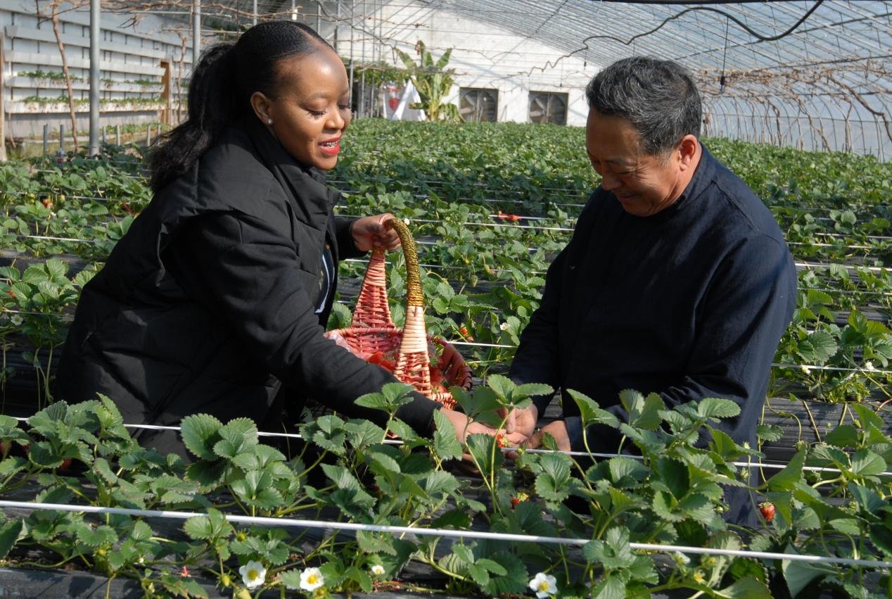 1月15日,山东省青岛市即墨区长江学校外籍教师非洲博兹瓦纳共和国的Dudu在即墨区移风店镇跟农民学习采摘草莓。