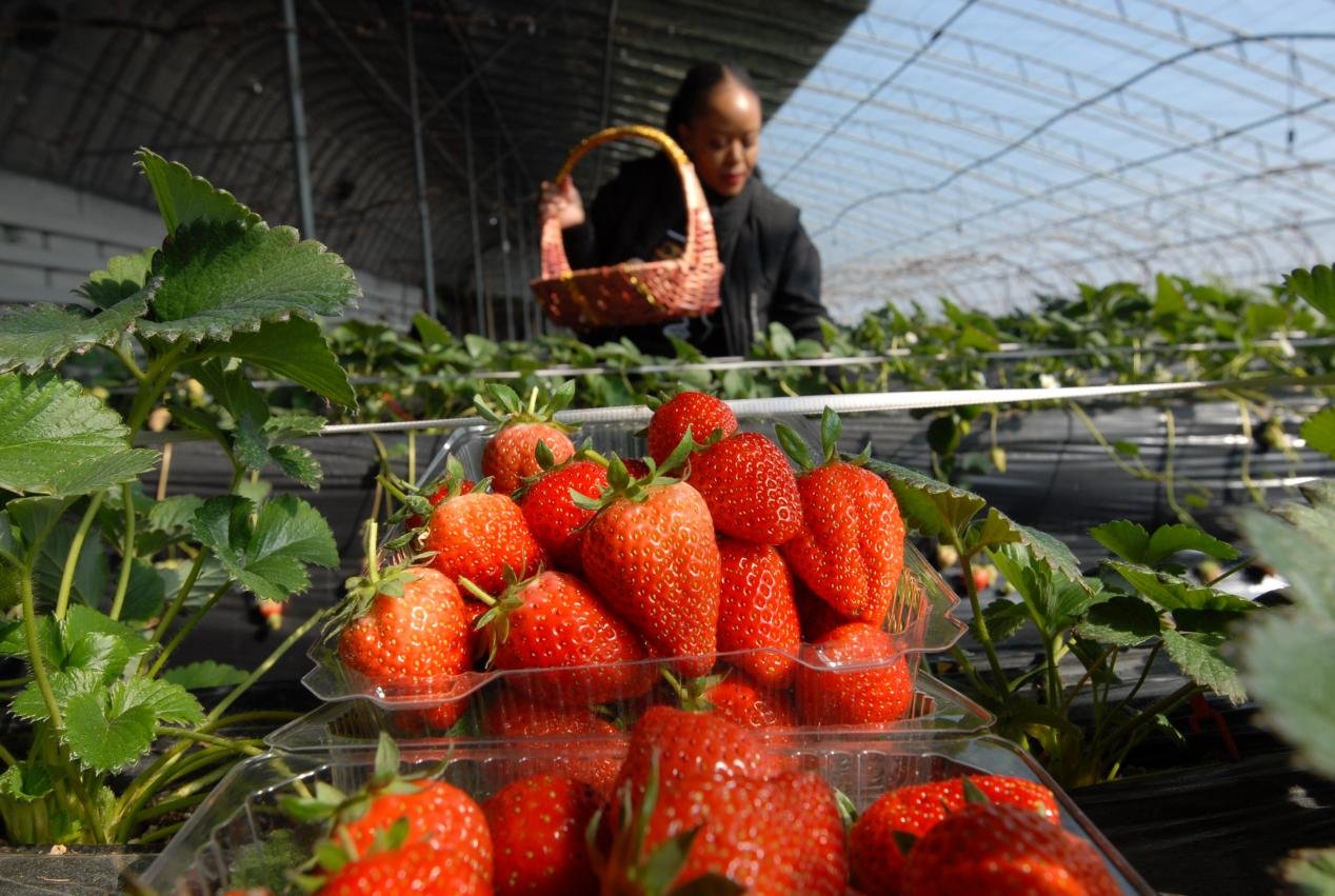 1月15日,山东省青岛市即墨区长江学校外籍教师非洲博兹瓦纳共和国的Dudu在即墨区移风店镇采摘草莓。