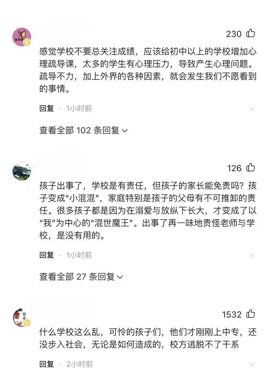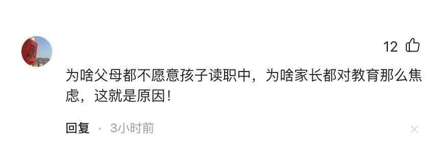 很多家长看到后,估计都无比伤心难过,与此同时很多人开始再次质疑职高技校,认为其管理太乱,学生整体素质太差,无法与普通高中相比,甚至有网友表示:为啥父母都不愿意孩子读职中,为啥家长都对教育那么焦虑,这就是原因!
