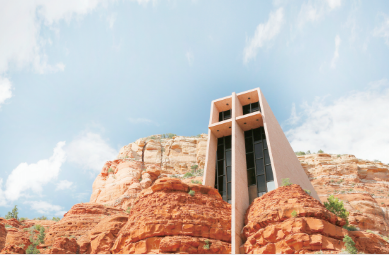 值得一提的是,圣多娜的红岩上有一座圣十字教堂,被一些业内人士视为建筑典范。教堂1956年动工,耗时18个月,耗资30多万美元。为了保持山体稳定,施工过程中没有用炸药,全靠人工清除2.5万多吨岩石。这座教堂的一面是落地窗,巨大的十字架镶嵌在岩壁里,显得神圣又气派。2007年,亚利桑那州民众将圣十字教堂称为亚利桑那人造奇观之一。