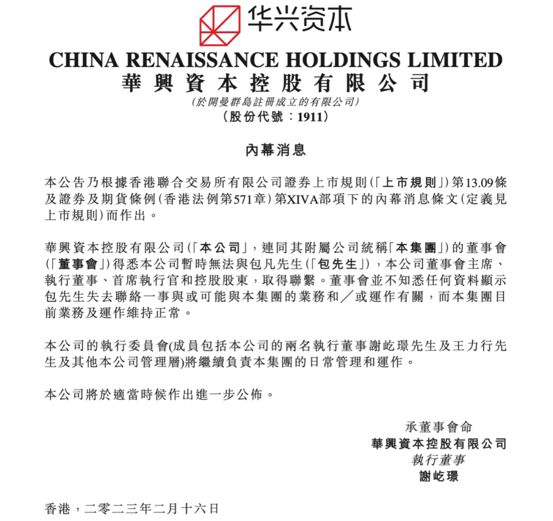 16日夜间10时,华兴资本发了这样一则公告,称公司暂时无法与包凡取得联系。并称公司并不知悉任何资料显示包凡失去联系一事或与可能与本集团的业务和/或运作有关。