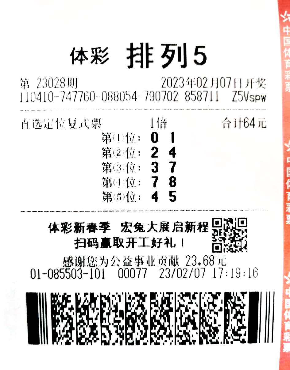 2月7日,中国体育彩票排列5第23028期,开奖号码为1、2、7、8、5,当期全国直选投注共中出115注一等奖,单注奖金10万元,郑州东区一购彩者收获其中1注。