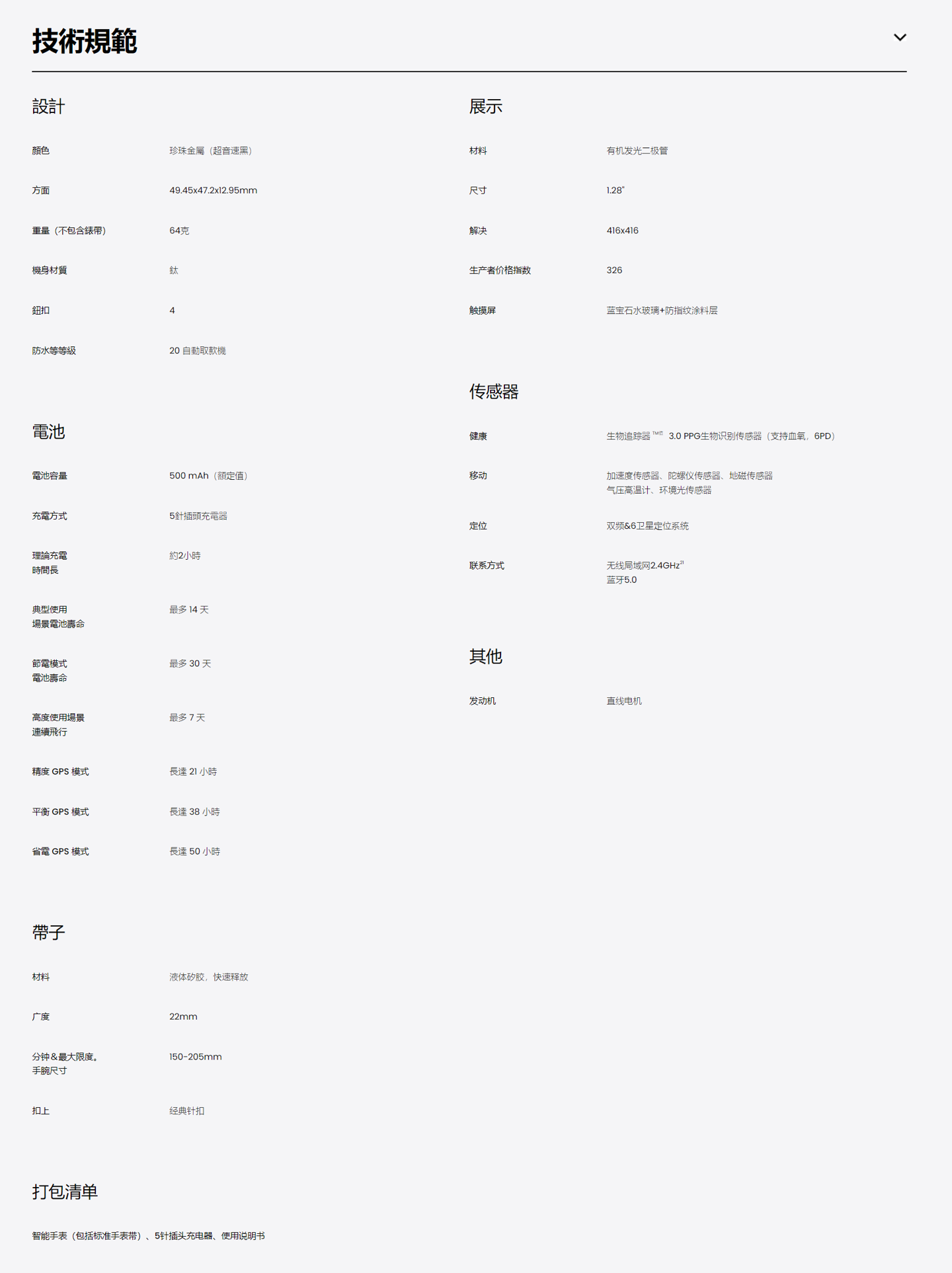 这款手表整体重量为 64 克 (不含表带) ,内置 500mAh 电池,在日常运作下可达到 14 天续航,重度使用模式下也可长达 7 天续航,省电模式下则可达到 30 天续航。