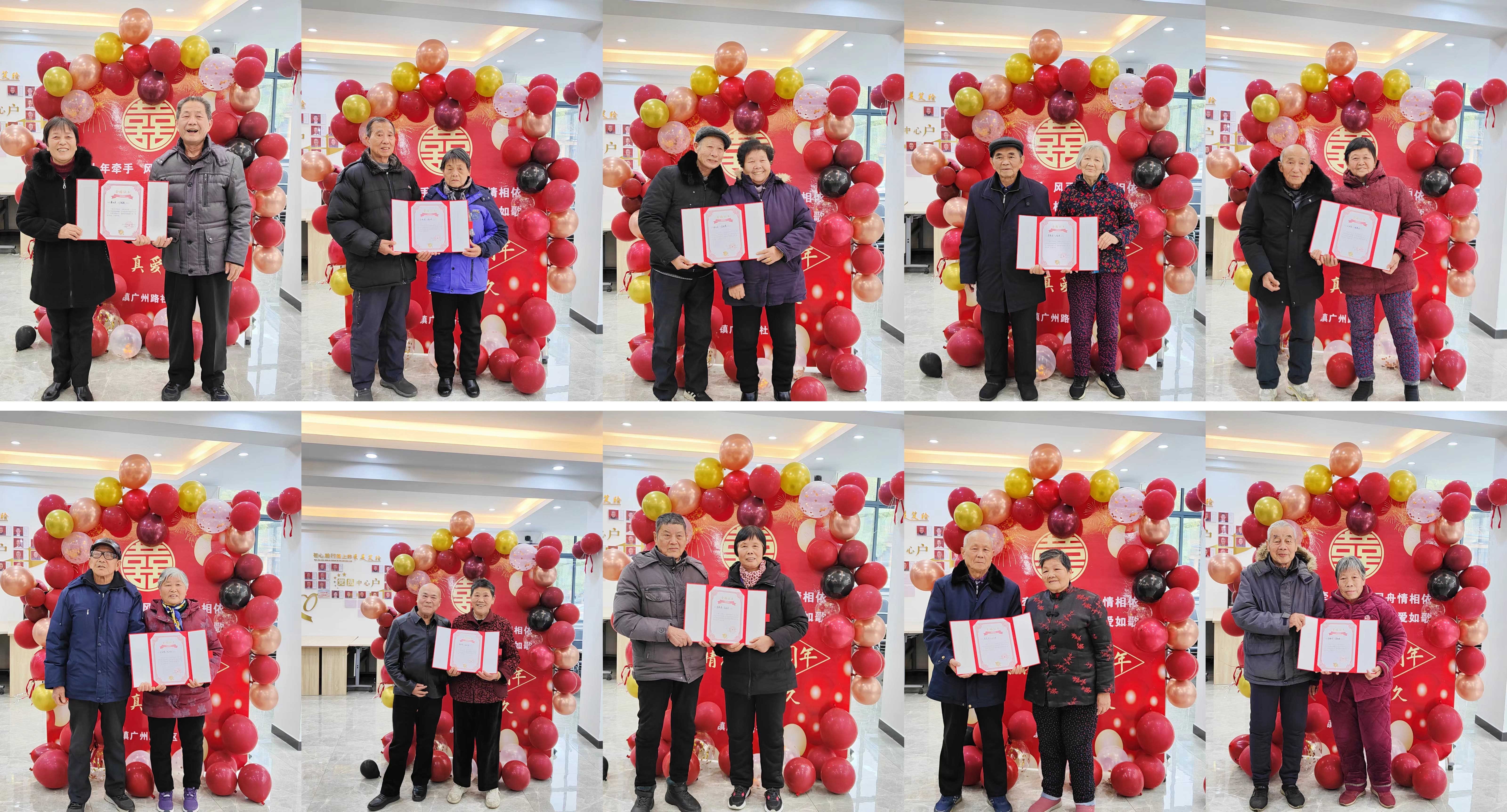 10对金婚老人手拿金婚证书“秀恩爱”。