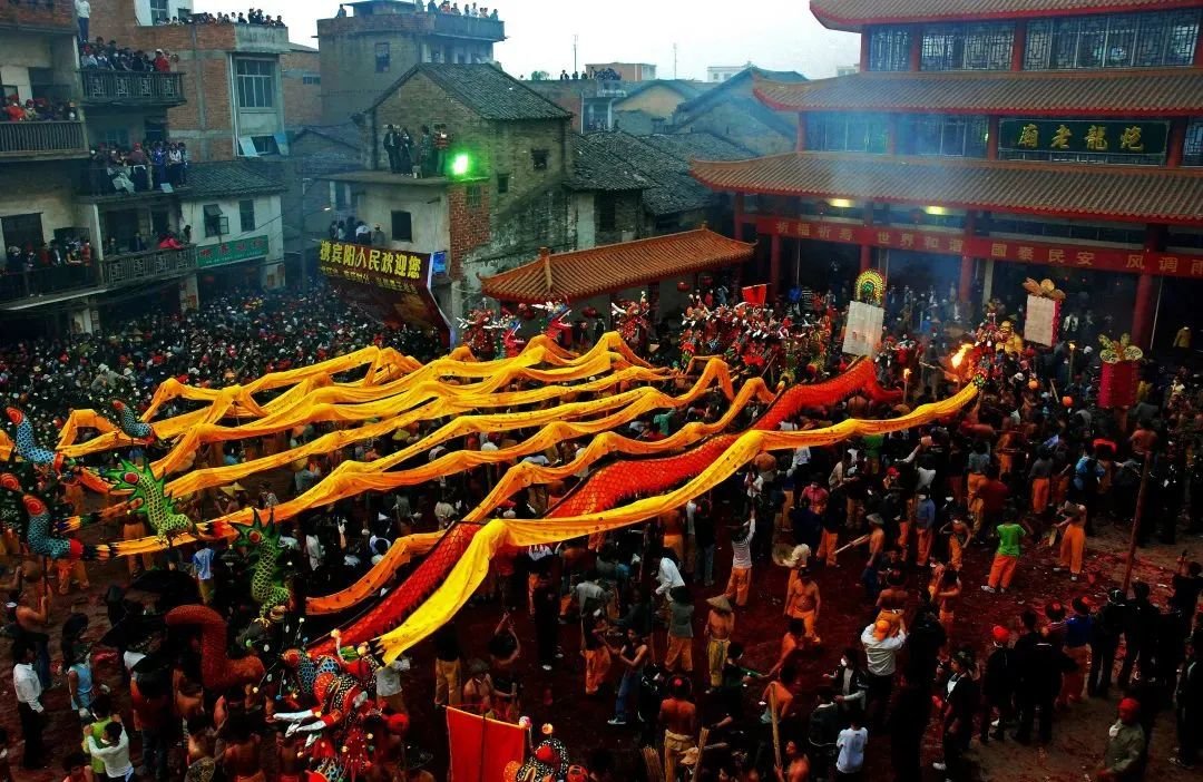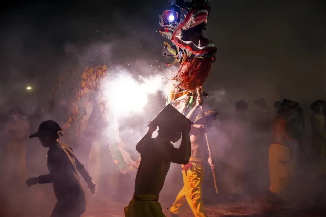 舞龙队大多戴着斗笠赤膊上阵,城中家家户户备好爆竹,只等炮龙一到万炮齐响。游客们也将手中的爆竹往龙身上丢,舞龙者愈加兴奋,任由爆竹在身边噼啪作响。