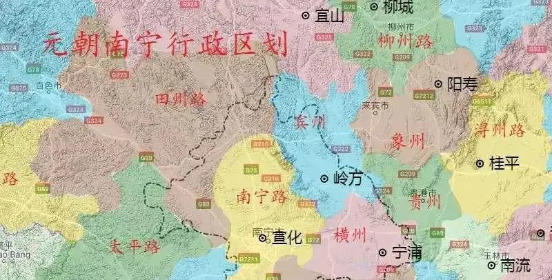 公元1278年,元朝升宾(宾阳县)、柳、邕(南宁)等5州为路一级的区划单位。1302年,为了精简行政体系,又“降容、象、横、宾路为州”。