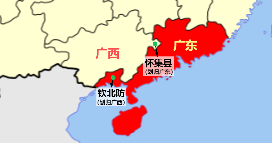 但明朝为了将南部海岸线管理权整合(利于防范海盗),同时出于分化广西和海南岛的壮、瑶、黎等民族联合反抗明朝统治,明朝将原属广西的海南岛、钦州、廉州等地划归广东,广西自此成为一个内陆省份。