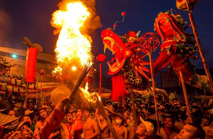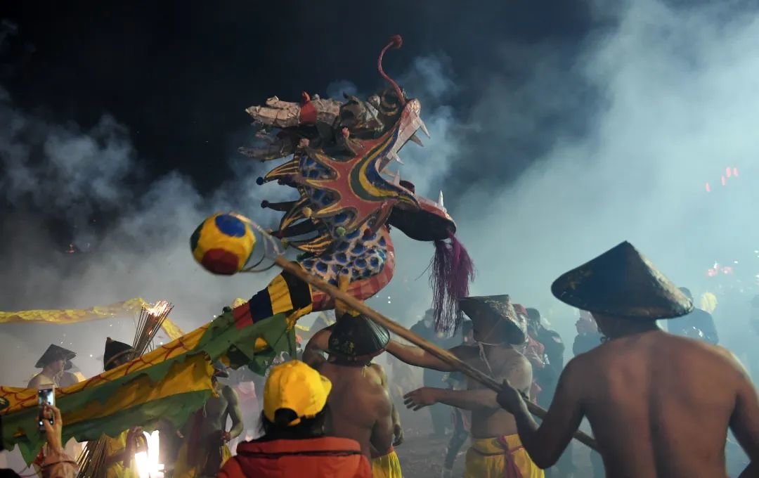 狂欢中炮龙来到街尾时已仅剩骨架,长者会指挥人们把龙投进火堆,祈求风调雨顺、国泰民安。