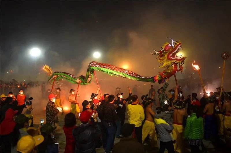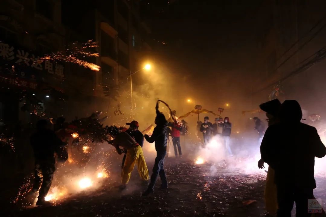 按惯例,农历正月十一晚七点左右举行炮龙开光仪式。开光后的白须巨龙舞动起来,在鞭炮和锣鼓声中,全城炮龙惊醒。