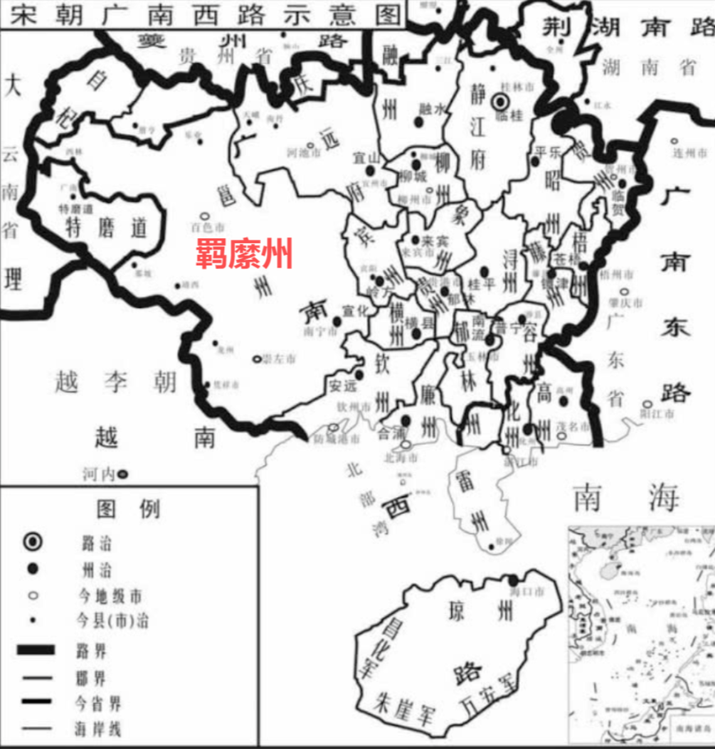 广南西路管辖今广西全境及海南岛和雷州半岛,但广西西南部仍是少数民族聚居地,北宋延续前边策略,在广西推进汉化的同时,对边陲的少数民族地区实施羁縻统治。