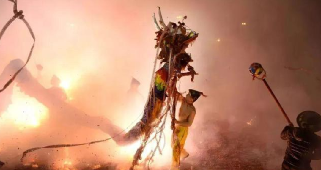 ▲赤膊的舞龙者,正在迎接四方的鞭炮