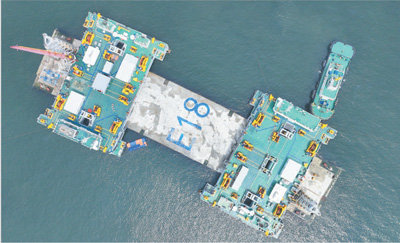 大连湾海底隧道最后一个管节E18开始沉放。田普江摄