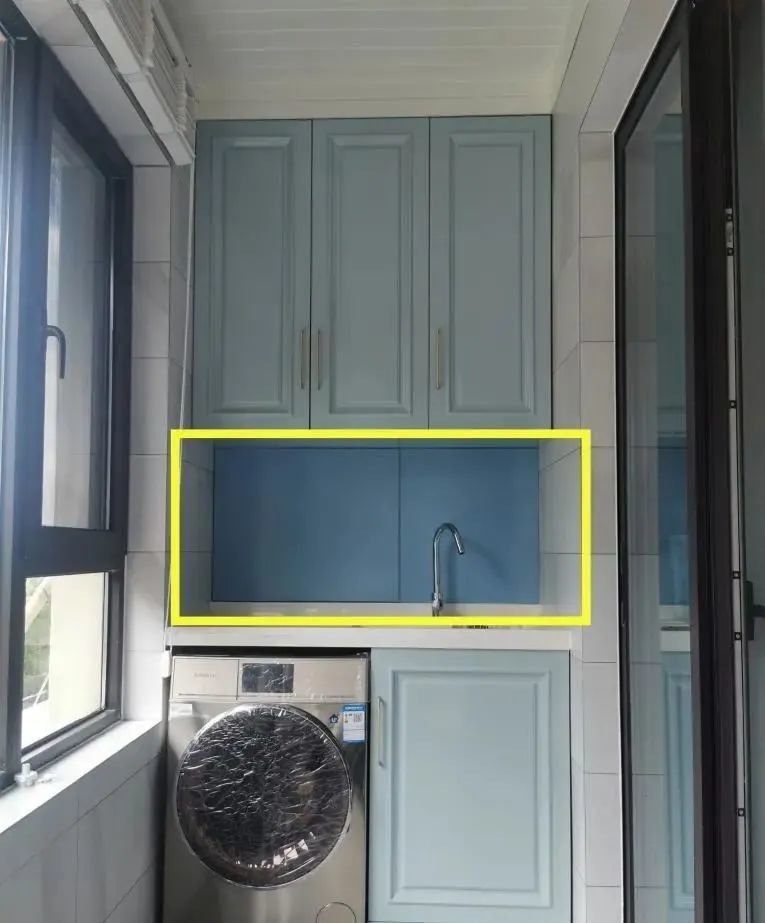 这位业主新房阳台也是作为生活阳台使用,在上下阳台柜中间墙面还藏了60cm高,宽12.5cm的收纳柜,充分利用了墙面空间,比一般阳台柜多了1倍收纳空间都不止,大家见过吗
