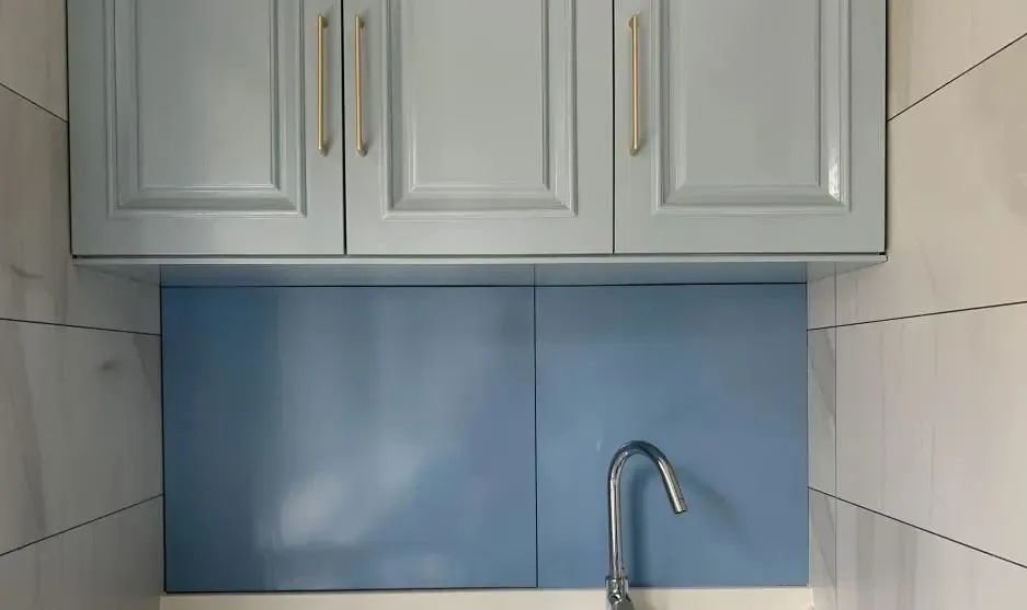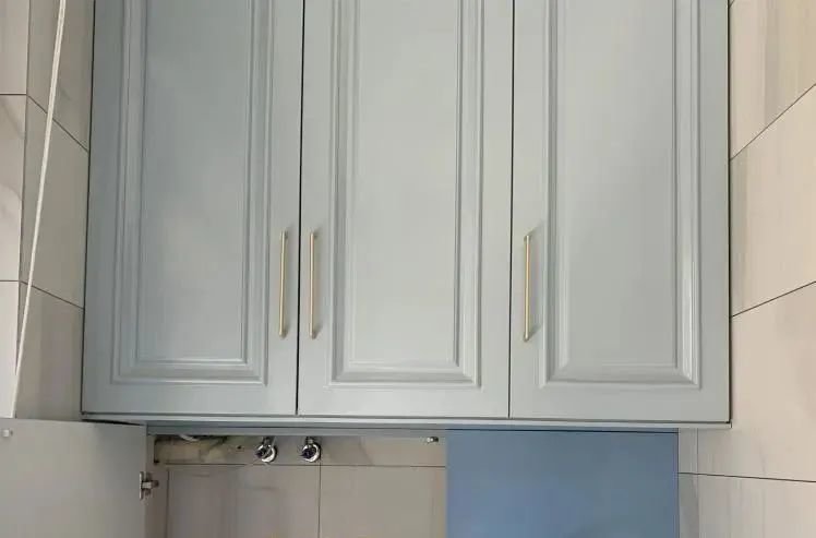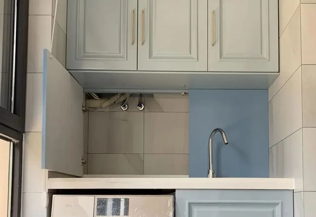 因为洗漱台上有水龙头,所以隐藏柜子的柜门只能打开一半,但收纳物品也不碍事,建议选择装无把手柜门,轻轻一按就能实现开合,超级方便。柜门颜色与上下阳台柜类似,颜色上没有太大的跳跃感,整体美观性比较好。